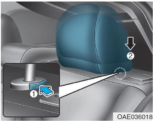 Druk de verstelknop (1) in om de hoofdsteun achter omlaag te zetten (2).