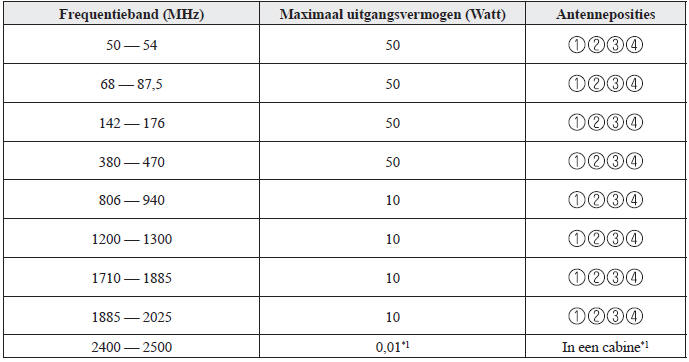 Uw Mazda is getest en goedgekeurd inzake bepaling UNECE *1 10 welke verband houdt met elektromagnetische compatibiliteit. Radio Frequentie (RF) zendapparatuur (bijv. mobiele telefoons, amateur radiozenders, enz.) mag enkel in uw Mazda geïnstalleerd worden als deze voldoet aan de parameters die in onderstaande tabel worden getoond.