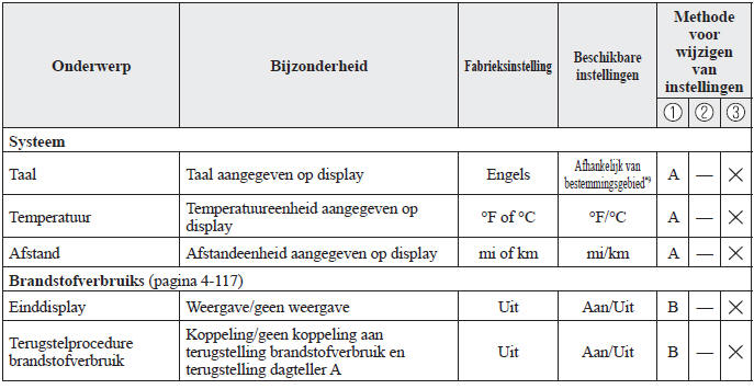 De volgende gebruikersinstellingen kunnen ingesteld of gewijzigd worden door de klant of een officiële Mazda reparateur. Raadpleeg een officiële Mazda reparateur voor details.