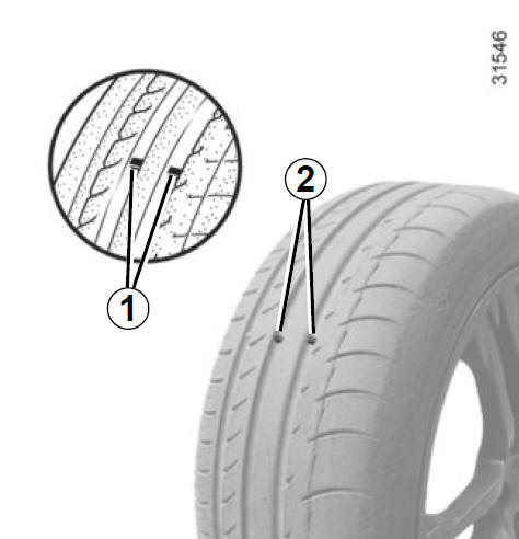 Als het loopvlak van een band tot aan deze stiften is weggesleten, worden ze zichtbaar 2: u moet dan deze band laten vervangen, omdat er nog slechts 1,6 mm profiel overblijft, waardoor de band op een natte weg onvoldoende grip heeft.