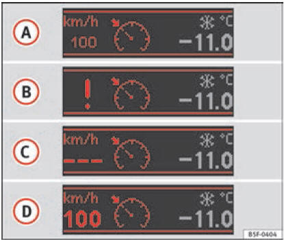D De GRA is actief. De geprogrammeerde snelheid wordt in grote cijfers weergegeven.